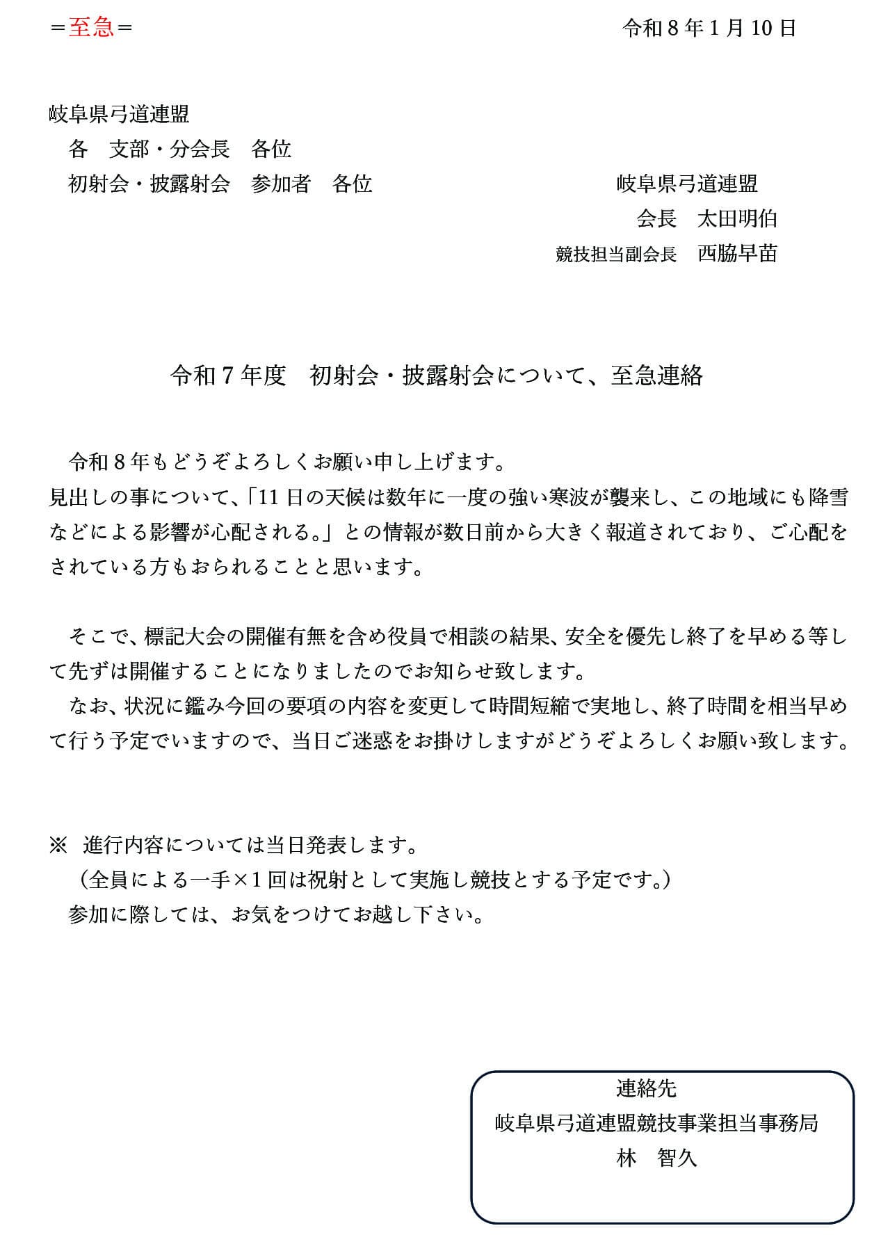 10年に一度の寒波が襲来するとの天気予報が繰り返し報道されており、明日の「披露射会・初射会」の開催が危ぶまれているところですが、「危機管理の観点」から、関係の方々で協議をしていただきました。